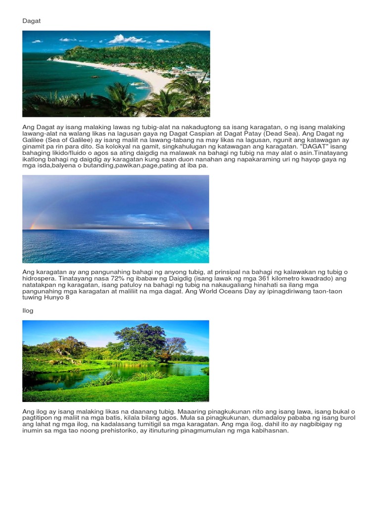 Ang bansang arkipelagong Pilipinas ay napapaligiran ng karagatan at mga dagat gaya ng Dagat Kanlurang Pilipinas na nasa kanlurang bahagi ng bansa o ang Karagatang Pasipiko na nasa silangang bahagi. 522020 Karagatan- Ang karagatan ay ang pangunahing bahagi ng anyong tubig at prinsipal na bahagi ng kalawakan ng tubig o hidrosperaTinatayang nasa 72 ng ibabaw ng Daigdig ang natatakpan ng karagatan. Taal Lake-Ang Lawa ng Taal ay isang lawang tubig tabang sa lalawigan ng Batangas sa pulo ng Luzon Pilipinas.