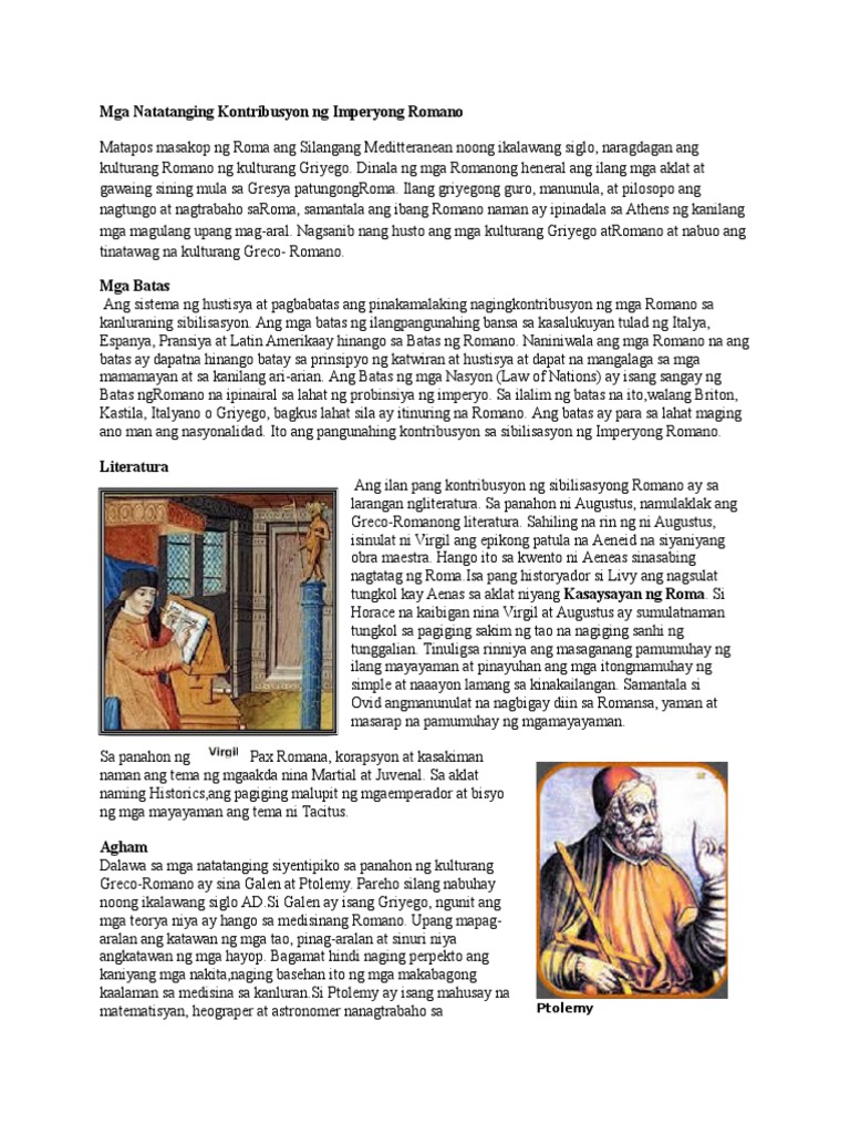 Upang matalos natin na tayoy may marangal at dakilang tradisyon na nagsilbing patnubay sa mga impluwensya ng ibang mga kabihasnang nanggaling sa ibat ibang mga bansa. Relihiyon Praktikal at may impluwensyang Griyego Halimbawa ng mga diyos. Pamana ng Romano sa Kabihasnan Pakitang-turo ni Gng.