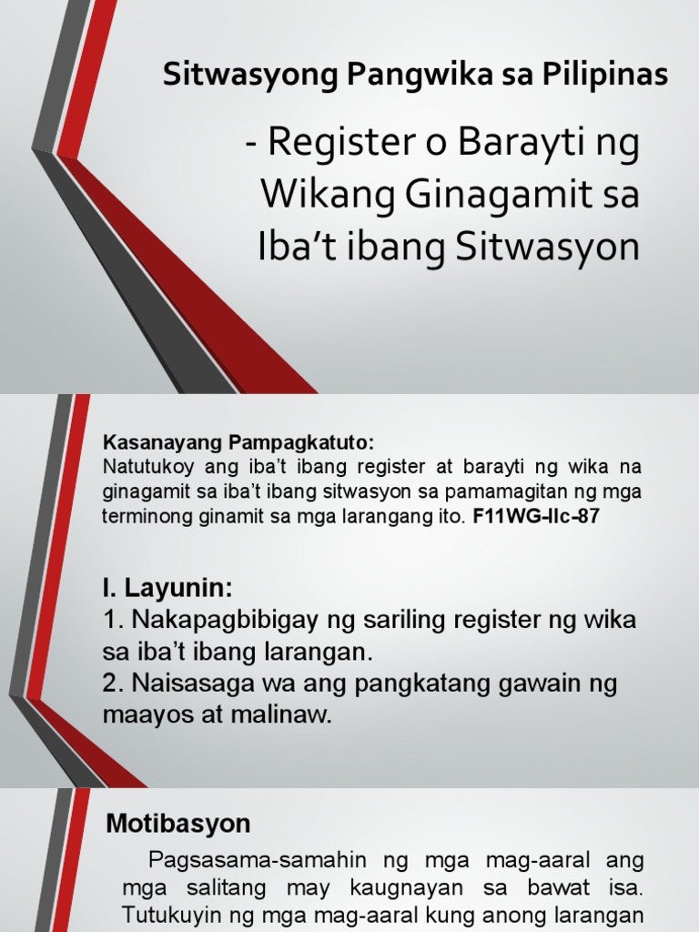 Ang blog na ito ay malayang pinamamahalaan ng mga mag-aaral na kasapi ng patnugutan nito kung kaya ang pamunuan ng paaralan at guro ng asignatura ay walang direktang pananagutan sa anumang pagkukulang sa mga nailalathalang materyal dito. Save Save Ang Sitwasyong Pangwika sa Pilipinas For Later. Nais naming ipagpatuloy at maslinangin ang Filipino.